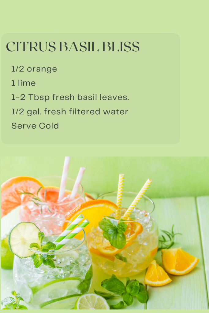 This vibrant infusion does more than just quench your thirst; it can enhance mental clarity and alertness, reduce stress and anxiety, improve mood, and promote relaxation, especially before bedtime. It aids digestion, supports heart health, relieves nausea and constipation, and helps prevent dehydration, which is especially beneficial during cancer treatment. The uplifting aroma of basil has the added bonus of energizing and elevating your mood, making this infusion a perfect companion for your daily wellness routine.
