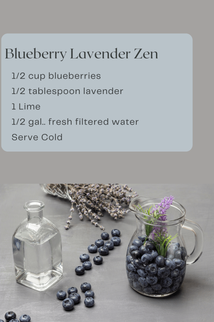 Blueberry and lavender-infused water is a delightful and refreshing beverage that offers a myriad of mental, physical, and spiritual benefits. Picture yourself sipping on this beautifully fragrant drink—it’s not just a treat for your taste buds but a boost for your overall well-being. Lavender, renowned for its calming properties, helps reduce anxiety and fosters relaxation, making every sip feel like a mini spa day. Its pleasant aroma can uplift your mood, while the combination of lavender and blueberries may enhance your focus and mental clarity.