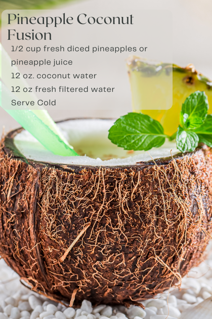Pineapple and coconut infused water is not just a delicious and refreshing drink but also offers numerous mental, physical, and spiritual benefits. Mentally, the natural sweetness and aroma of pineapple and coconut can uplift your mood and enhance mental clarity. Proper hydration, essential for cognitive function, is maintained through this flavorful drink, providing a natural energy boost without the crash associated with sugary beverages. Physically, both pineapple and coconut water are excellent for hydration, with coconut water being rich in electrolytes that help maintain fluid balance. Pineapple’s bromelain enzyme has anti-inflammatory properties, aiding digestion and supporting immune health with its high vitamin C content.